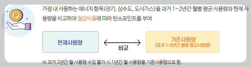 | 전기 절약 | 전기사용량 감축 | 가구 또는 사업시설에서 사용하는 에너지(전기, 상수도, 도시가스)를 과거 2년 평균사용량 대비 감축하였을 경우 감축 비율에 따라 포인트 지급 - 연간 2회(6월,12월) 지급되며 1포인트당 최대 2원 지급(지자체 별 상이) |